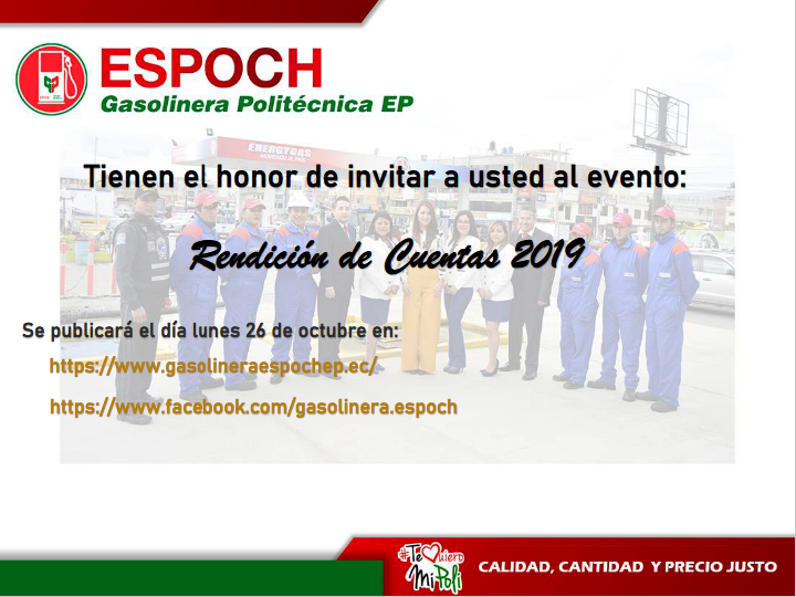 Quienes formamos parte de la Estación de Servicios ESPOCH Gasolinera Politécnica EP, extendemos la cordial invitación a la Rendición de Cuentas del período 2019. Como parte de nuestra gestión, queremos informar a la ciudadania de los proceso que se llevan a cabo, para el logro de objetivos institucionales, de la ESPOCH y la ciudadania en general.
